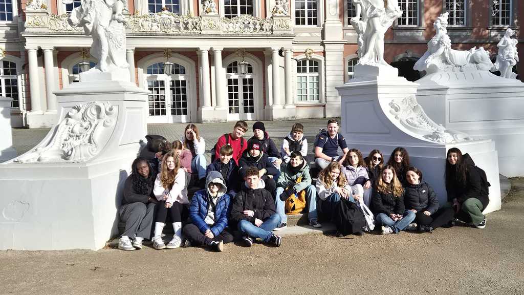 Nachdem wir im Juli erfahren hatten, dass wir einen Preis erhalten sollten, fuhren am 11.09.2024 13 Schülerinnen und Schüler, der mittlerweile zehnten Klasse, nach Mainz. Begleitet wurden die Jugendlichen von Frau Sands und unserem FSJler Herr Seil. Auch Frau Souchet von unserer Partnerschule, dem Lycée Rosa Parks in Thionville, reiste an. Im Salon des Institut français wurde die Gruppe zunächst vom Hausherrn und anschließend von Herrn Jonathan Spindler vom Partnerschaftsverband begrüßt. Der dritte Platz, den die erfolgreichen Teilnehmeden erreichten, ist verbunden mit einem Gutschein über 400,-€. Außerdem wurden allen Jugendlichen eine Urkunde sowie einige Geschenke des Landtags Rheinland-Pfalz überreicht.